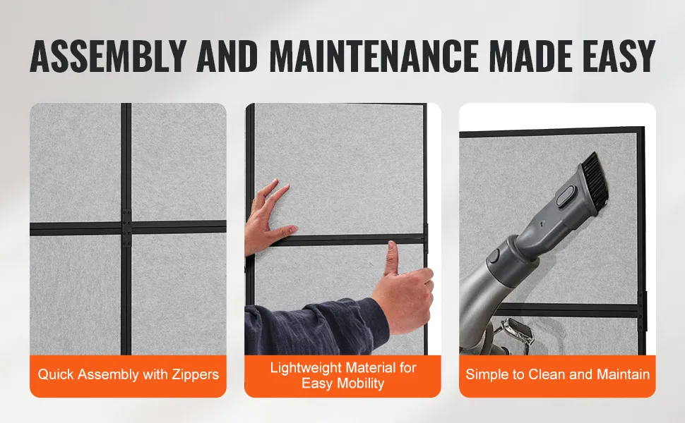 Einfache Montage & Mobilität: Da alle erforderlichen Zubehörteile und eine ausführliche Installationsanleitung im Lieferumfang enthalten sind, lässt sich der Bildschirm ganz einfach und ohne Bohren zusammenbauen. Verbinden Sie die Paneele einfach mit den Reißverschlüssen und stecken Sie die Metallrohrverbindungen in die unteren Löcher der Trennwände. Die Montage dauert etwa 15 Minuten und wir empfehlen zwei Personen für einen schnelleren Aufbau.