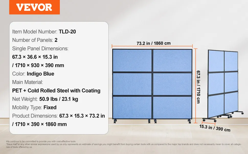 VEVOR Raumteiler Trennwand Paravent Schallschutzwand Doppelpanel, tragbare Bürotrennwand mit Polyester und Stahlkabinenwand, Raumtrenner (171 x 93 x 39 cm), Indigoblau