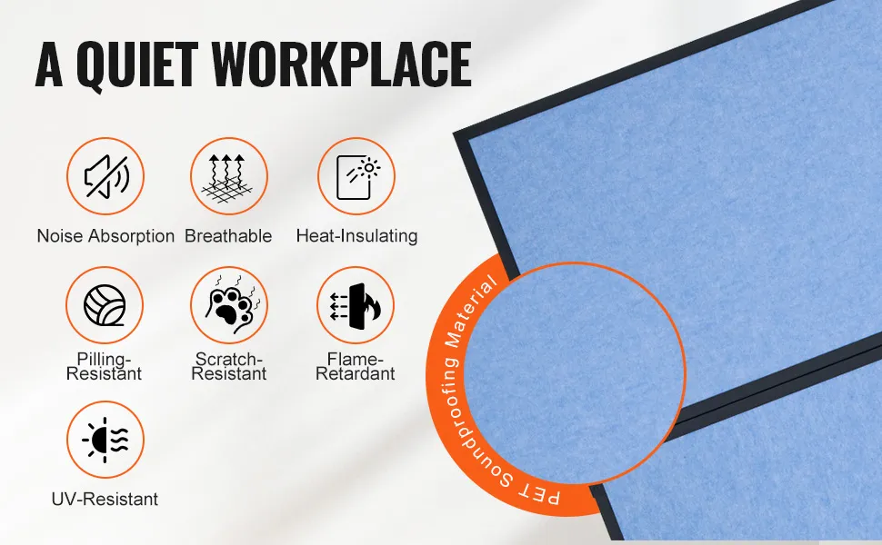 Schalldämmendes PET-Material: Unser Trennwandgewebe wurde auf schalldämmendes PET-Material aufgerüstet, das 85 % der Umgebungsgeräusche absorbiert. In Kombination mit einer weichen Polsterung verbessert es die Privatsphäre, Wärmedämmung, Atmungsaktivität und Lichtblockierung erheblich und schafft so eine ruhige Arbeitsumgebung.