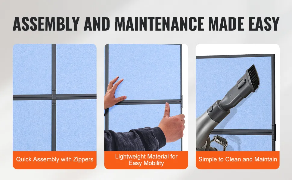 Einfache Montage und Mobilität: Da alle erforderlichen Zubehörteile und eine ausführliche Installationsanleitung im Lieferumfang enthalten sind, lässt sich der Bildschirm ganz einfach und ohne Bohren zusammenbauen. Verbinden Sie die Paneele einfach mit den Reißverschlüssen und stecken Sie die Metallrohrverbindungen in die unteren Löcher der Trennwände. Die Montage dauert etwa 15 Minuten und wir empfehlen zwei Personen für einen schnelleren Aufbau.