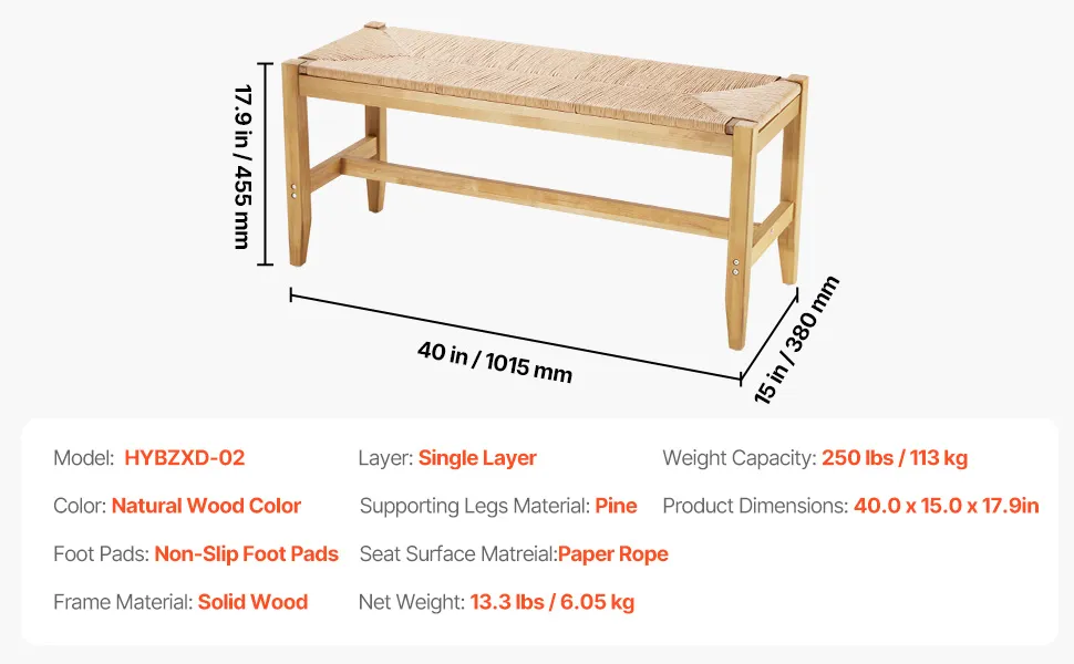 VEVOR Rattanbank Eingangsbank Sitzbank Gartenbank 1015 x 380 x 455 mm mit Beinen aus Eichenholz, Flurbank Bank Boho-Bank mit handgeflochtenem Rattan, für Wohnzimmer Schlafzimmer Diele Flur Balkon