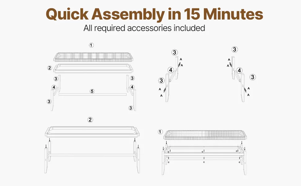 Diese Holzbank wird mit allen erforderlichen Teilen und einer klaren Anleitung geliefert, sodass sie in etwa 15 Minuten zusammengebaut werden kann.