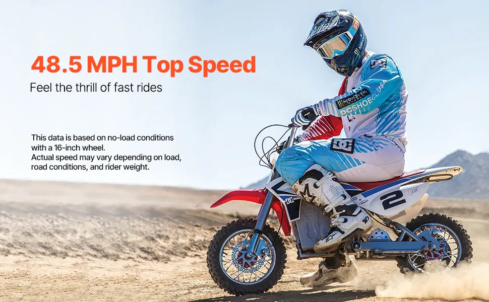 Erleben Sie den ultimativen Nervenkitzel mit 77 km/h Leerlaufgeschwindigkeit! (Diese Höchstgeschwindigkeit basiert auf Leerlaufbedingungen mit einem 16-Zoll-Rad – die tatsächliche Geschwindigkeit kann je nach Beladung, Straßenbedingungen und Fahrergewicht variieren)