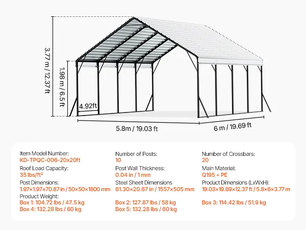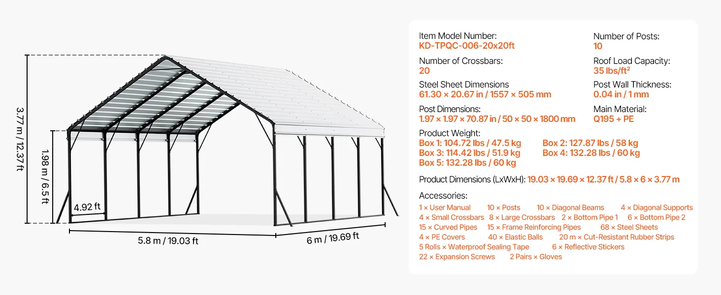 Unser 20 x 20 Fuß großer Hochleistungscarport ist für Limousinen, SUVs und LKWs geeignet und bietet ausreichend Platz, um Ihr Fahrzeug vor den Elementen zu schützen.