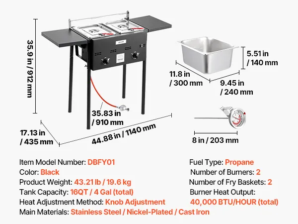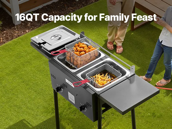 4 Gal Doppeltank aus Edelstahl: Diese Propangas-Fritteuse für den Außenbereich hat ein Gesamtvolumen von 4 Gallonen mit einer klaren Fülllinie – bitte nicht überfüllen, um Verschütten zu vermeiden. Ideal zum gleichzeitigen Frittieren mehrerer Speisen bei Veranstaltungen im Freien – langlebig und leicht zu reinigen