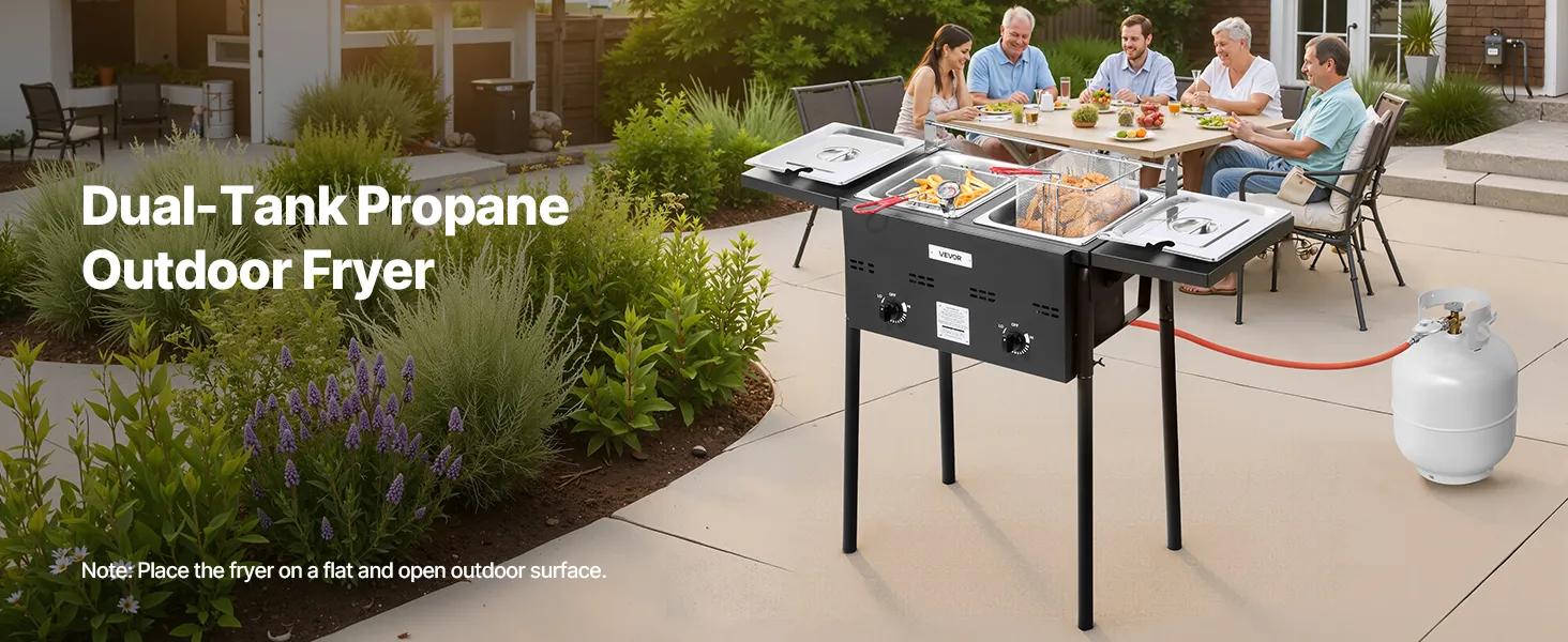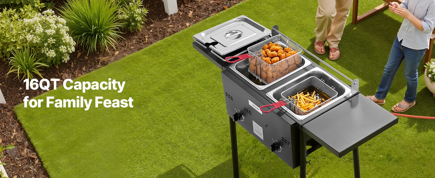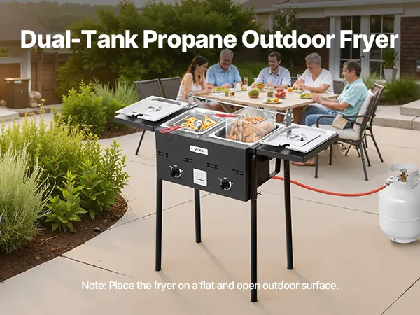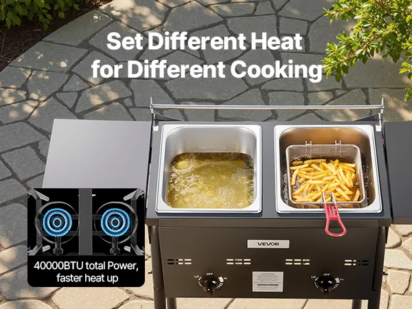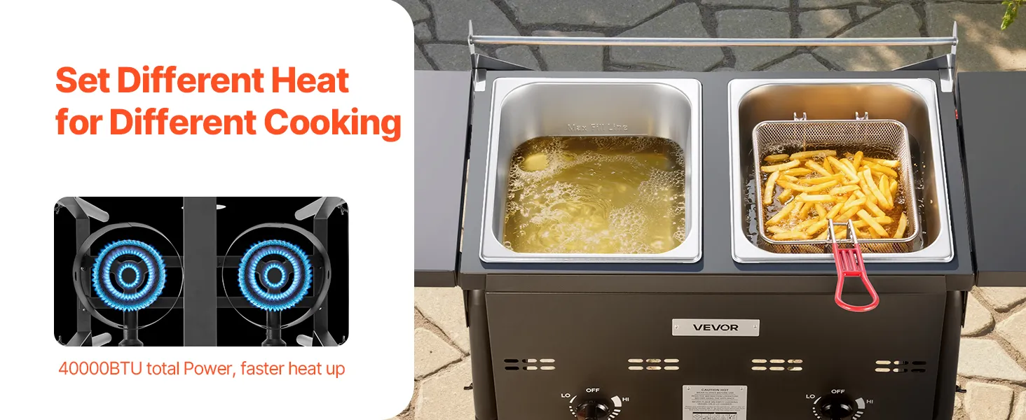Diese Fritteuse ist für gleichzeitiges Garen konzipiert und vereint Zuverlässigkeit mit Doppelbrennern mit 40.000 BTU (insgesamt) und windgeschütztem Design. Ideal für das Frittieren im Freien bei Feiern: Die Doppeltanks ermöglichen effizientes Frittieren von Pommes und Hähnchen bei stabiler Temperaturkontrolle.