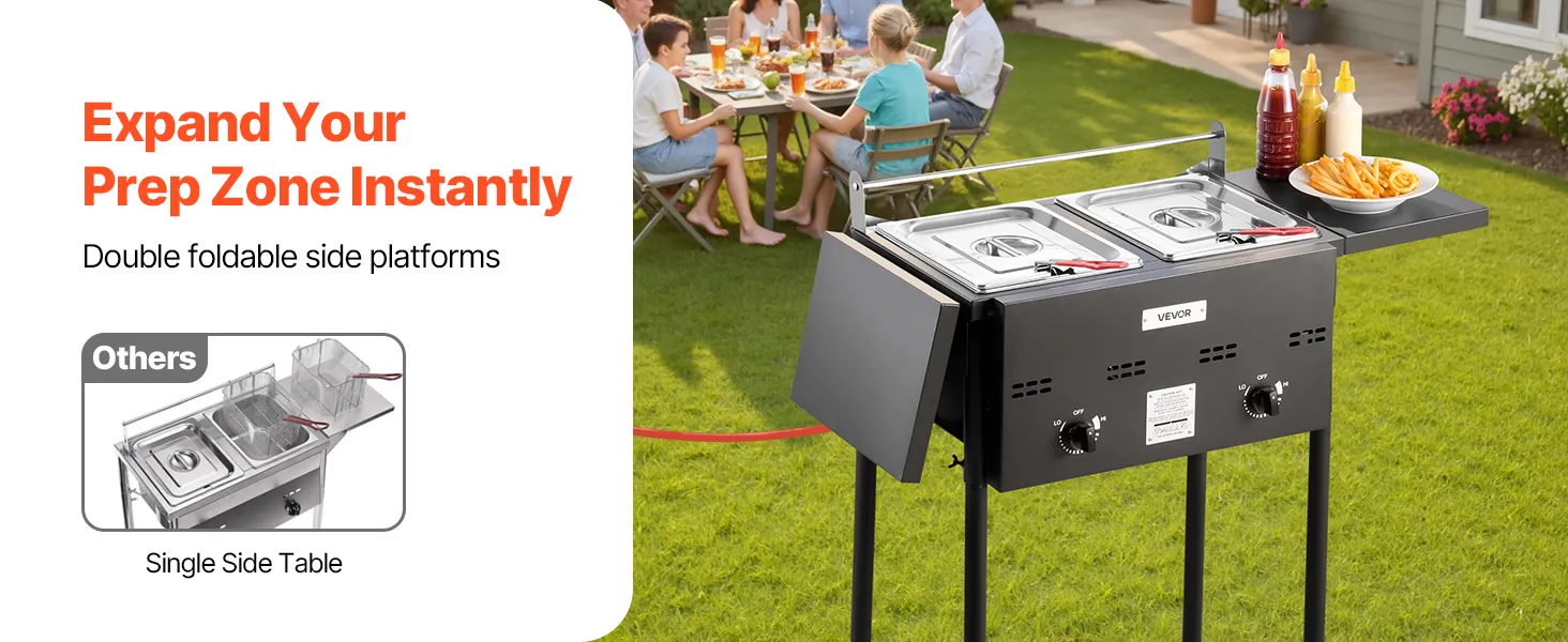 Zwei klappbare Vorbereitungstische: Die Standfritteuse verfügt über zwei klappbare Seitentische, die sich zu einem geräumigen Vorbereitungsbereich für Zutaten, Gewürze und Utensilien erweitern und anschließend flach zusammenklappen lassen, um sie kompakt zu verstauen – konzipiert für das Kochen im Freien