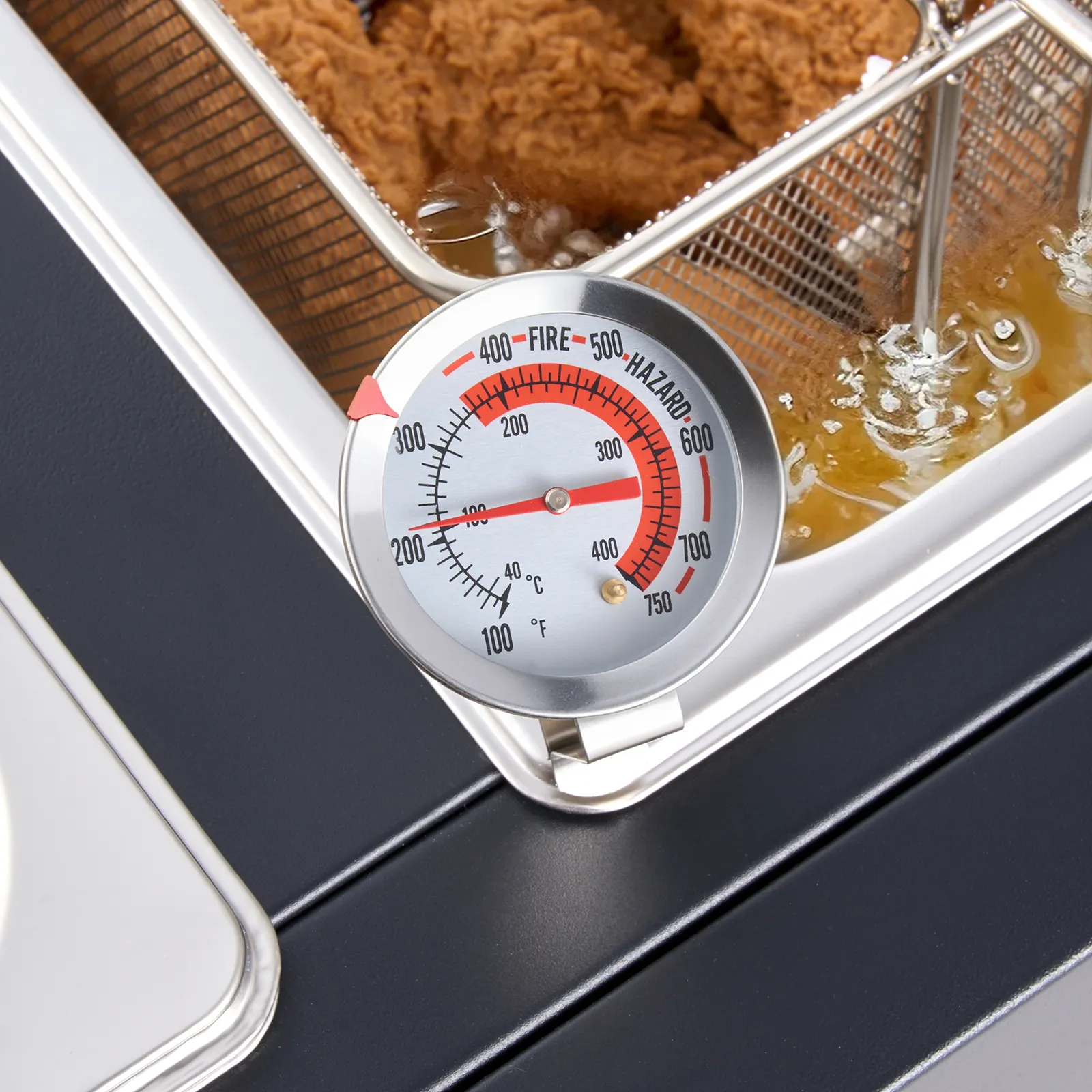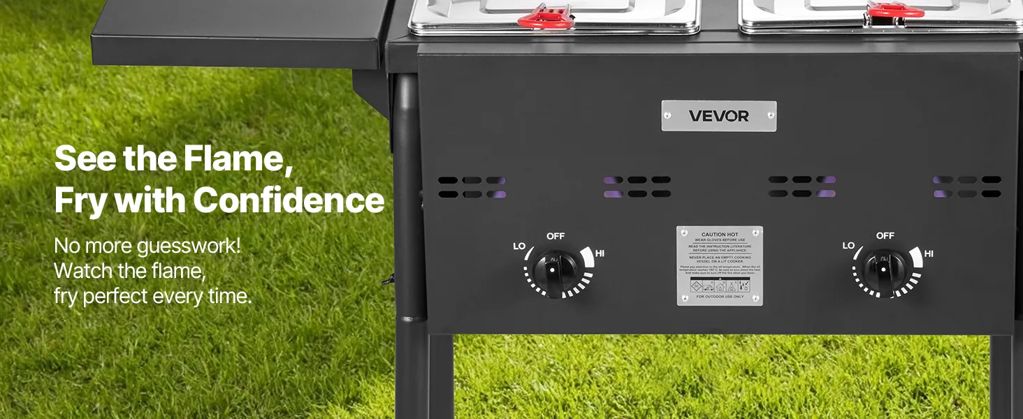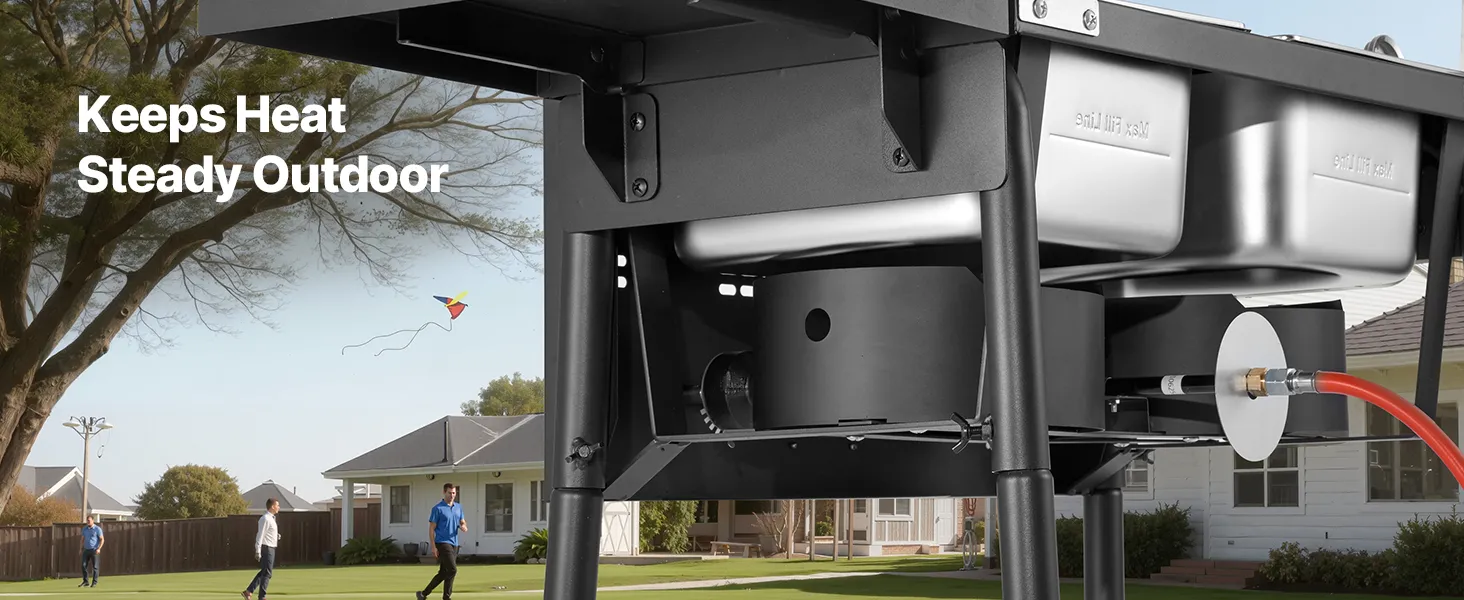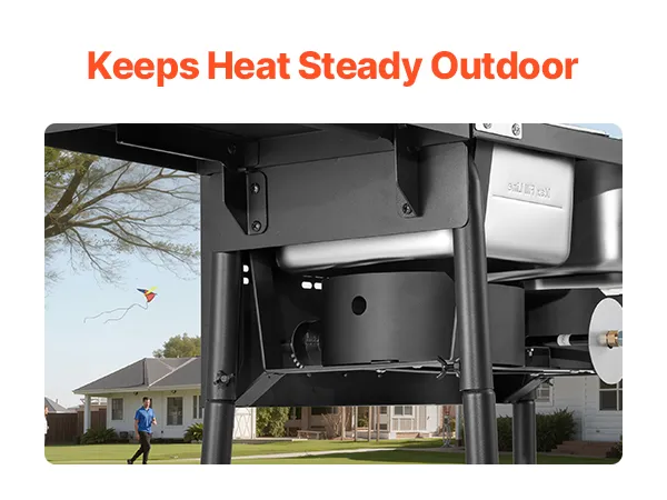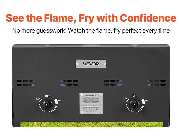 Separate Steuerung mit zwei Knöpfen: Die Fritteuse für den Außenbereich liefert eine Gesamtwärme von 40.000 BTU/h und verfügt über zwei Knöpfe zur unabhängigen Temperaturregelung. Sichtbare Flammenfenster und Windleitbleche verhindern Zugluft, während ein Thermometer für präzise Temperatur beim Frittieren sorgt