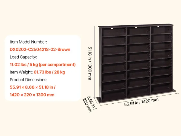 VEVOR DVD-Regal mit 24 Fächern (8 Ebenen), Medienregal Standregal 142 x 22 x 130 cm, Platzsparendes Aufbewahrungsregal für CDs DVDs Bücher Spiele-Discs, Bücherregal für Wohnzimmer/Homeoffice, Braun