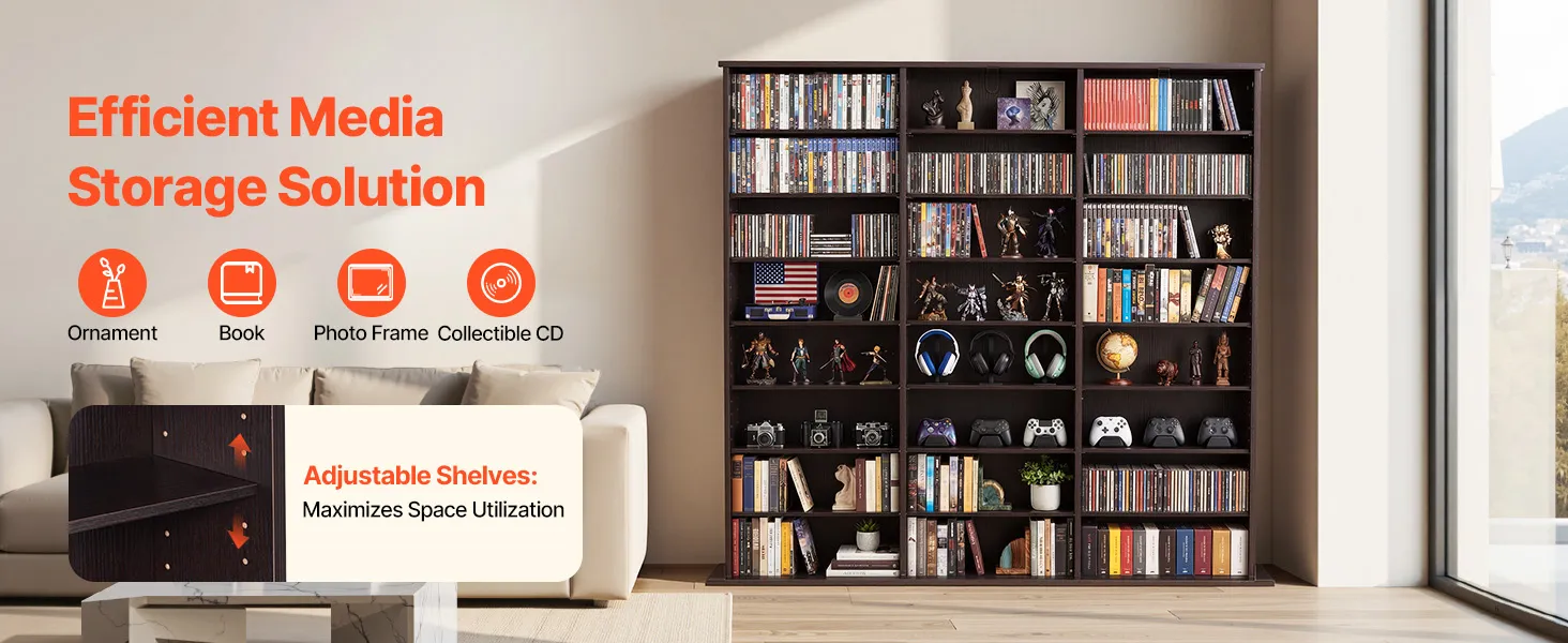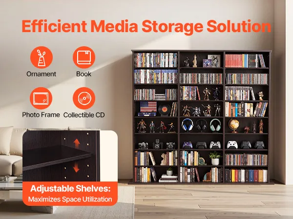 Flexible Aufbewahrung: Unser Medienregal verfügt über verstellbare Einlegeböden, deren Höhe an verschiedene Größen angepasst werden kann. Passen Sie die Aufteilung flexibel an Ihre Sammlungen an und nutzen Sie den Platz optimal aus, während alles ordentlich und übersichtlich präsentiert wird