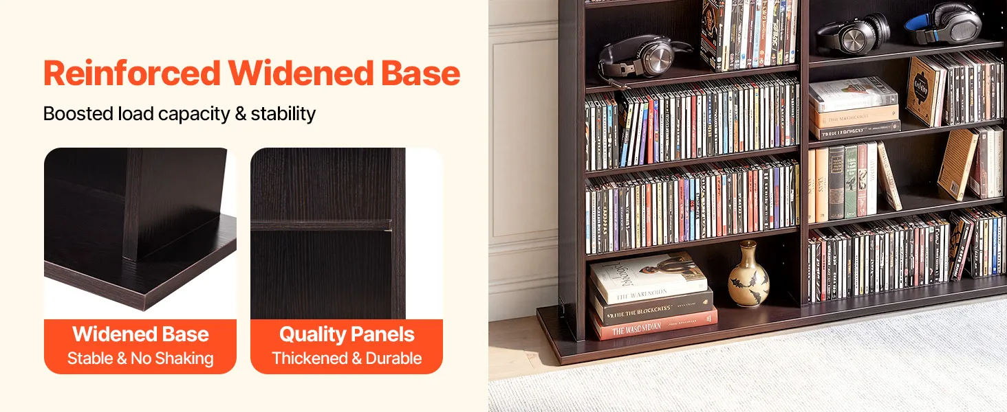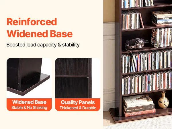 Dank des verbreiterten Sockels bietet dieses DVD-Regal erhöhte Stabilität und steht fest an seinem Platz. Die robuste Konstruktion schützt Ihre wertvolle Sammlung und sorgt für einen sicheren Halt im täglichen Gebrauch.