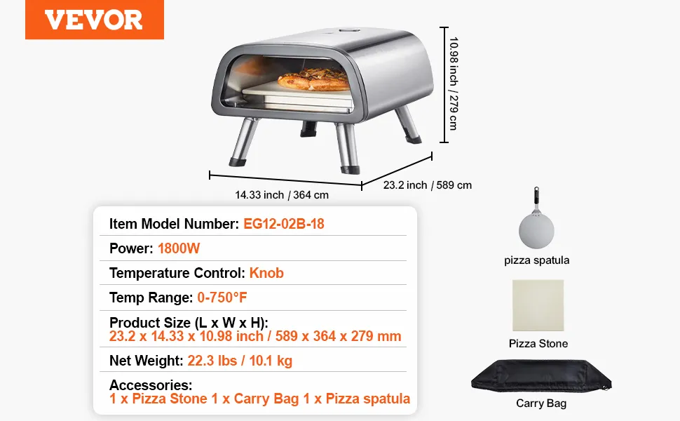 VEVOR elektrischer Pizzaofen Backofen 305 mm, Pizzamaker aus Edelstahl mit Pizzastein, Spatel, Doppelknopf, heizt bis zu 427 °C auf, Mehrzweck-Pizzaofen zum Backen von Brezeln im Restaurant zu Hause