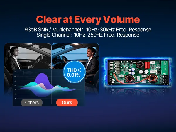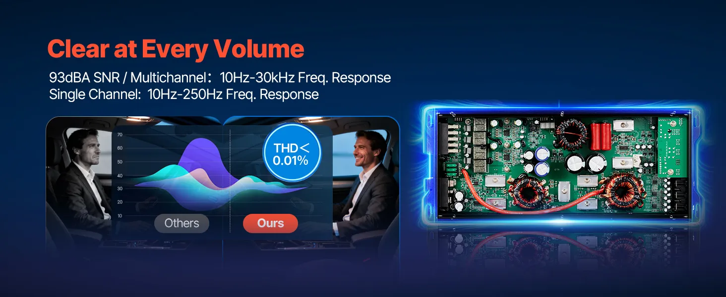 • Kristallklare Audioqualität: Mit geringer Verzerrung (THD weniger als 0,01 %) und einem Signal-Rausch-Verhältnis von 93 dBA liefert dieser 5-Kanal-Verstärker einen sauberen, präzisen Klang von tiefen Bässen bis hin zu sanftem Jazz mit minimalen unerwünschten Nebengeräuschen