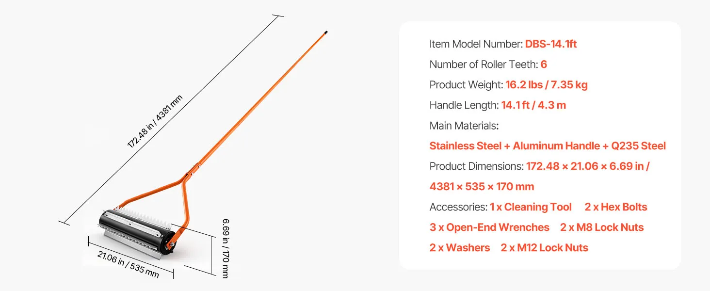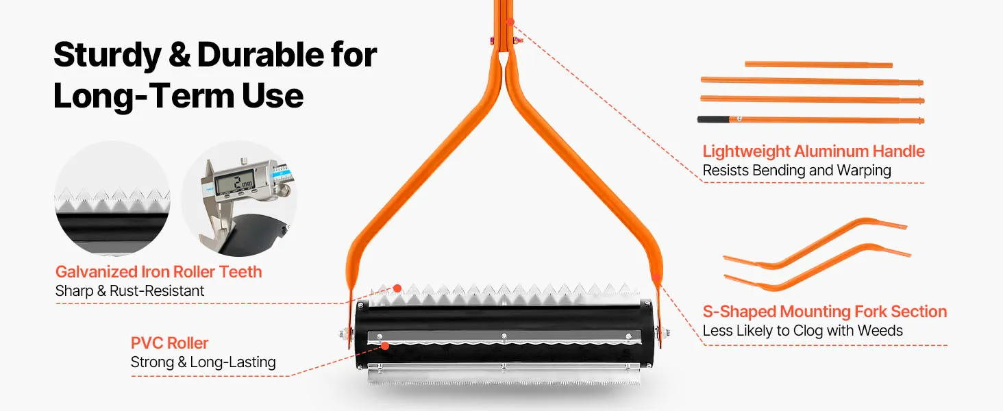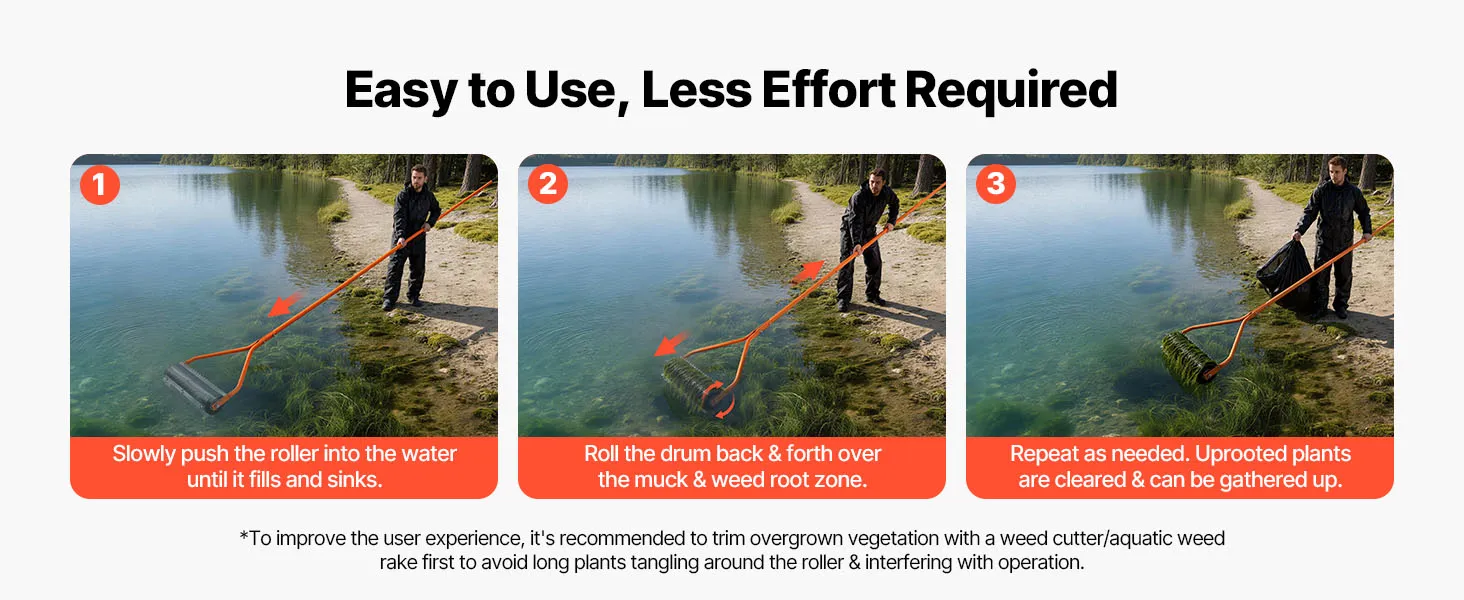 Einfache Bedienung: Die Unkrautwalze für Seen ist mit einem leichten Aluminiumgriff ausgestattet, der die Ermüdung reduziert. Dank des 4-fach verstellbaren Griffs erreichen Sie mühelos auch weiter entfernte Unkräuter, und das mitgelieferte Reinigungswerkzeug entfernt schnell und einfach Pflanzenreste