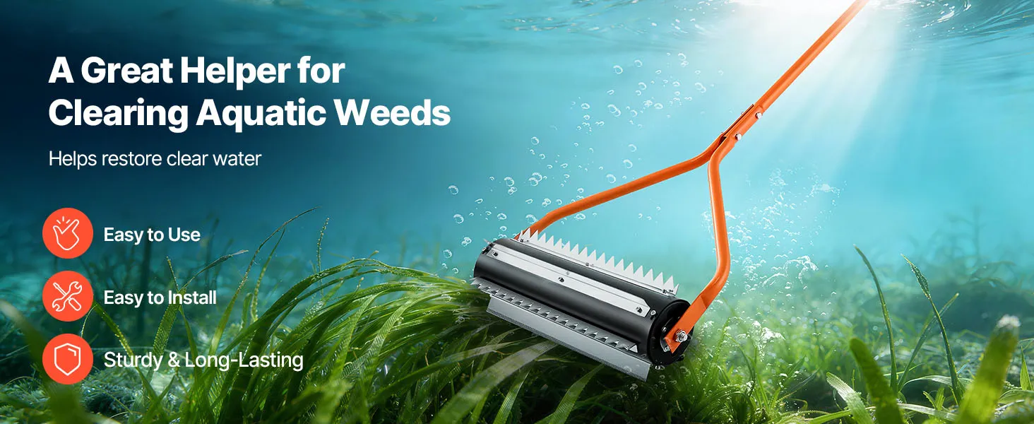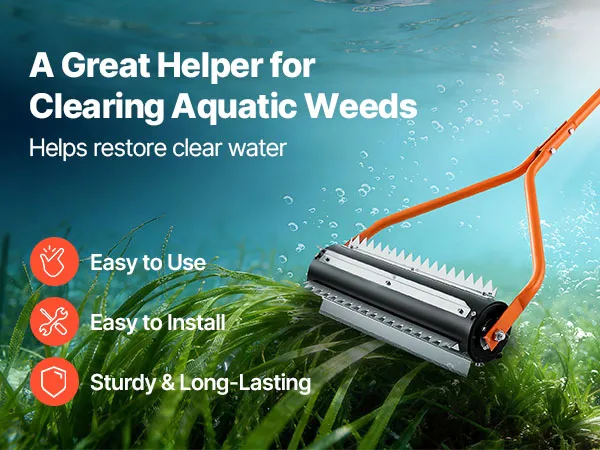 Dieser Teichrechen verfügt über scharfe Walzen, die Wasserpflanzen samt Wurzeln herausziehen. Sie lockert außerdem den Schlamm am Gewässergrund auf, um Ablagerungen zu reduzieren, und trägt bei regelmäßiger Anwendung zu klarerem Wasser bei.