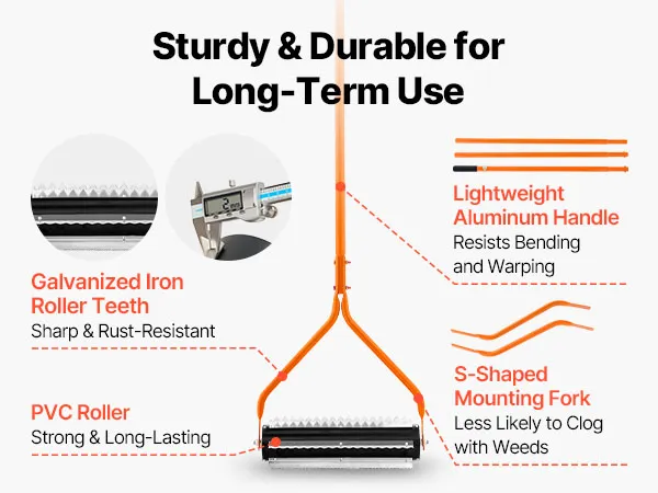 Robuste Konstruktion: Dieser aus Metall gefertigte Seegrasentferner ist besonders langlebig. Die S-förmige, geteilte Gabelverbindung zwischen Walze und Griff sorgt für mehr Durchlässigkeit und verhindert Verstopfungen durch groben Schmutz