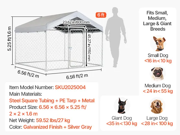 Mit Abmessungen von 2 x 2 x 1,6 m (6,56 x 6,56 x 5,25 Fuß) bietet diese Hundehütte für den Außenbereich einen geräumigen und luxuriösen Raum, in dem große Hunde rennen, herumstreifen und sich komfortabel entspannen können.