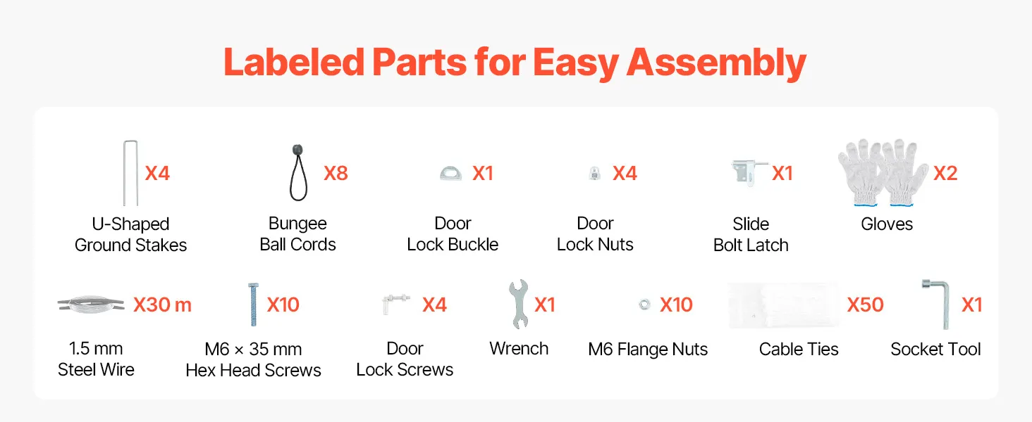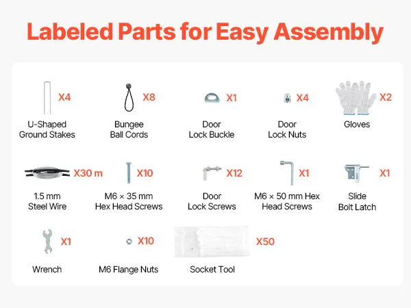 Der Hundekäfig für den Außenbereich wird mit komplettem Zubehör und Schutzhandschuhen geliefert. Beschriftete Teile und separate Verpackung erleichtern den Aufbau und sparen Zeit.