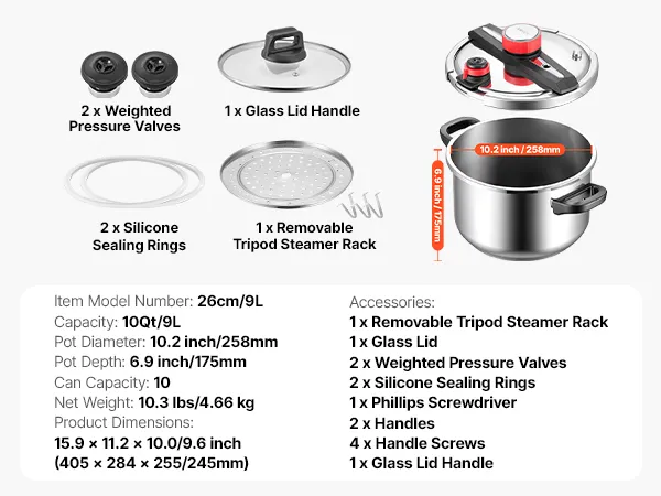 VEVOR Schnellkochtopf 9 L, Dampfkochtopf aus Edelstahl mit Dampfeinsatz & Deckel aus Gehärtetem Glas & 3 Druckstufen für Fleisch Bohnen Reis Suppen Soßen, Schnellkochtopf bis zu 100 kPa