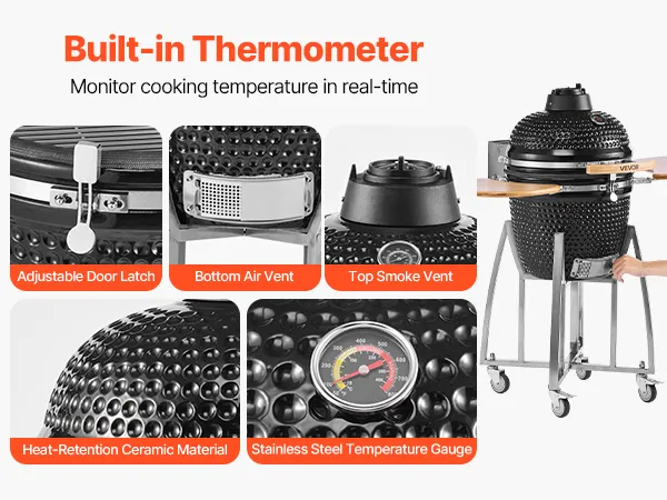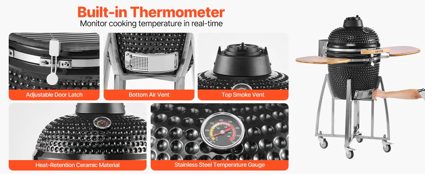 Durchdachte Details: Dank verstellbarer Rauchabzüge oben und unten, eingebautem Thermometer und verstellbarem Türverschluss können Sie Luftstrom und Temperatur einfach steuern und so das BBQ-Aromaerlebnis optimieren (Nur für Holzkohle geeignet, nicht für direktes Brennholzverbrennen)