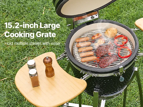 Großzügige Grillfläche: Unser Kamado Keramikgrill verfügt über einen großzügigen, 385 mm breiten Grillrost, auf dem mehrere Steaks gleichzeitig Platz finden und so das Garen in mehreren Portionen überflüssig wird. Zwei praktische Seitenablagen bieten zusätzlichen Stauraum und Arbeitsfläche zum Grillen