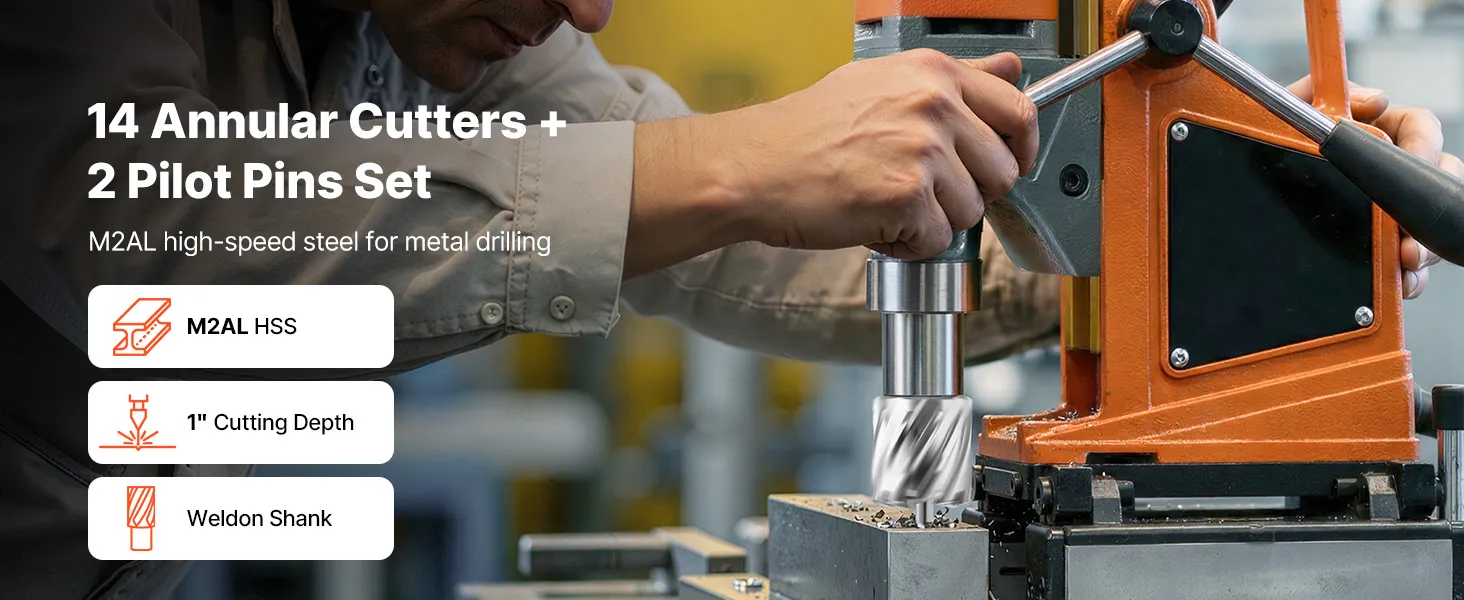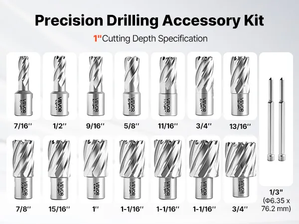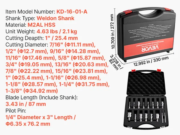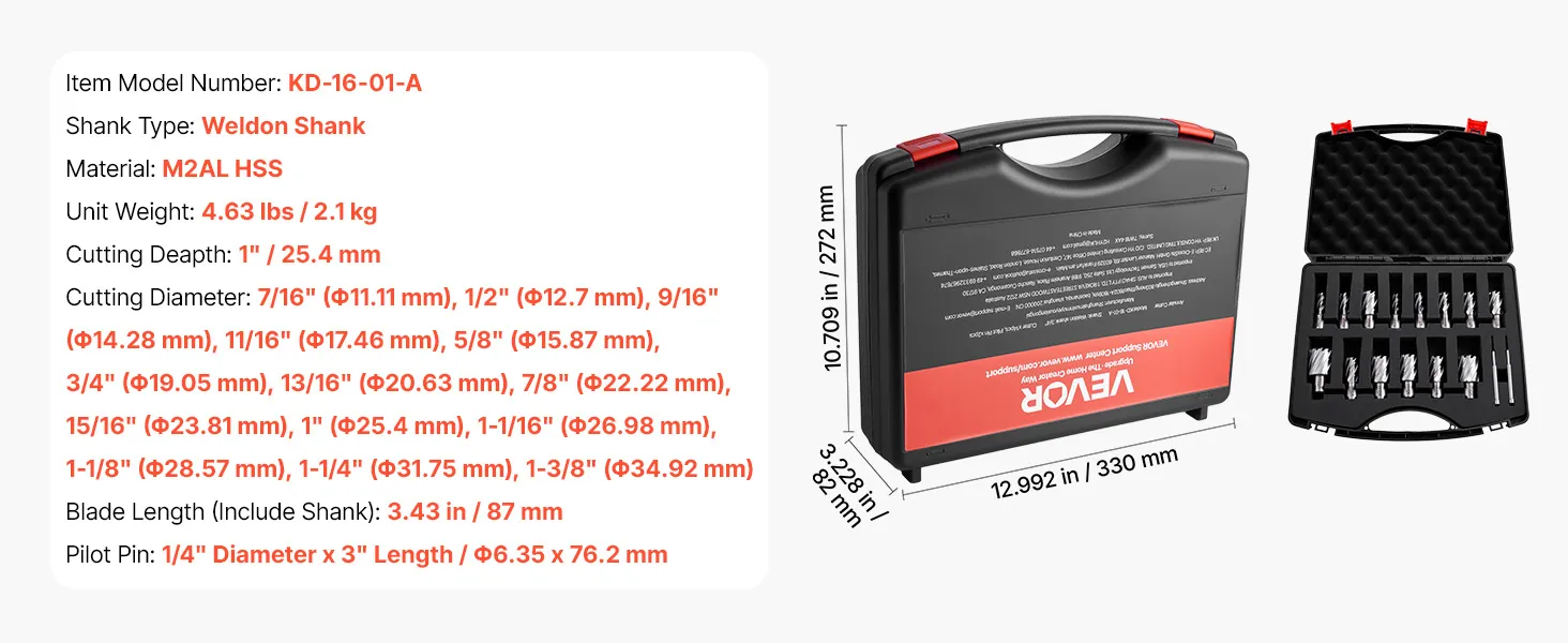 VEVOR HSS-Kernbohrer Weldon-Schaft 16-tlg. Magnetbohrer 11,11–34,92 mm Schnittdurchmesser, 14 Bohrer mit 2 Zentrierstiften, 25,4 mm Schnitttiefe, Kunststoffkoffer, für Magnetbohrmaschinen Aluminium