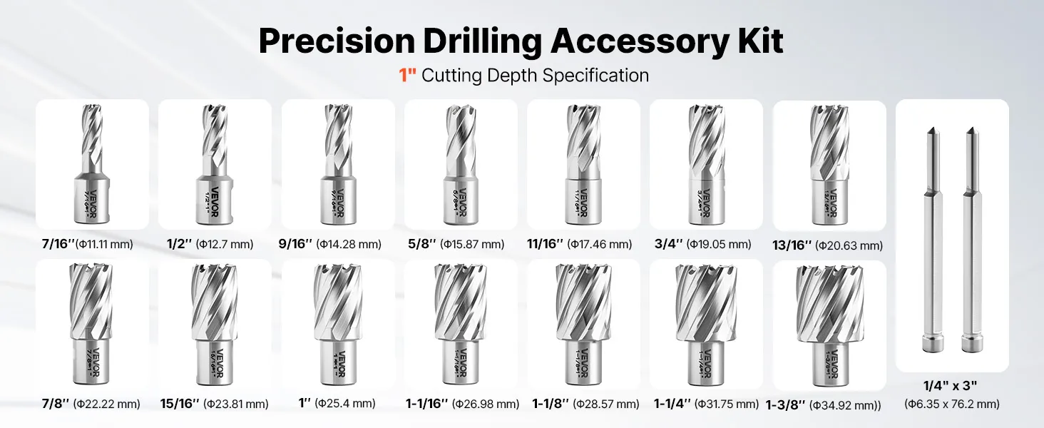 • 16-teiliges Bohrerset für den täglichen Einsatz: Unser Magnetbohrer-Set enthält 14 Bohrer (7/16, 1/2, 9/16, 11/16, 5/8, 3/4, 13/16, 7/8, 15/16, 1, 1-1/16, 1-1/8, 1-1/4, 1-3/8 Zoll), zwei Zentrierstifte (1/4 x 4 Zoll) sowie einen Aufbewahrungskoffer