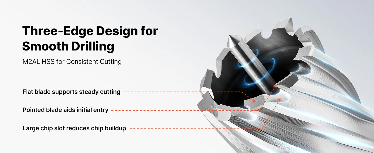• Optimaler Spanabfluss: Diese Ringbohrer verfügen über ein ringförmiges Schneiddesign, das nur dort schneidet, wo es erforderlich ist. Vergrößerte Spankanäle unterstützen den Spanabfluss beim Bohren. Die flache, spitz zulaufende Schneidengeometrie sorgt für einen gleichmäßigen Schnitteingriff