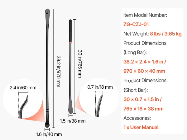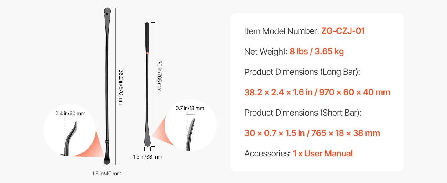 2 robuste Reifenheber: Dieses Set enthält einen 97 cm / 38,2 Zoll langen und einen 76,5 cm / 30 Zoll kurzen Reifenheber, die für die Einzelbedienung mit optimaler Hebelwirkung und Kontrolle konzipiert sind. Der längere Heber löst mühelos festsitzende Reifenwülste, während der kurze Heber besseren Halt und präzise Kontrolle bietet