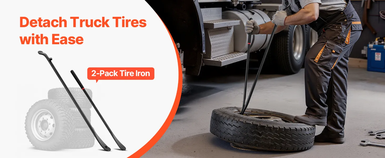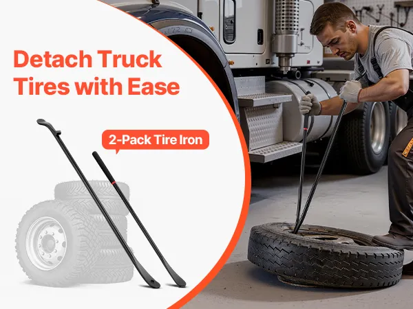 Dieses Doppelstangen-Set ermöglicht es einer Person, schwere Reifenwechsel an LKW, Transportern und Geländewagen allein durchzuführen. Die gleichzeitige Nutzung beider Hebel trennt den Reifen effektiv von der Felge, was den Prozess einfacher und effizienter macht.