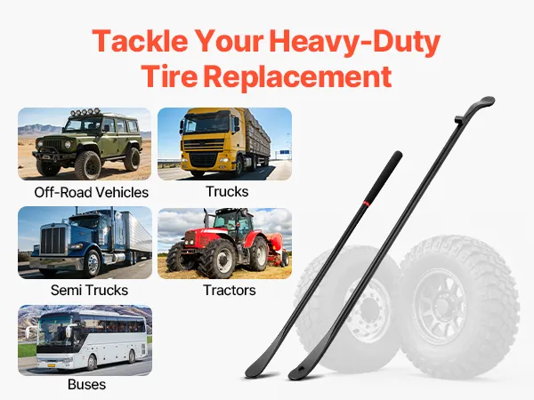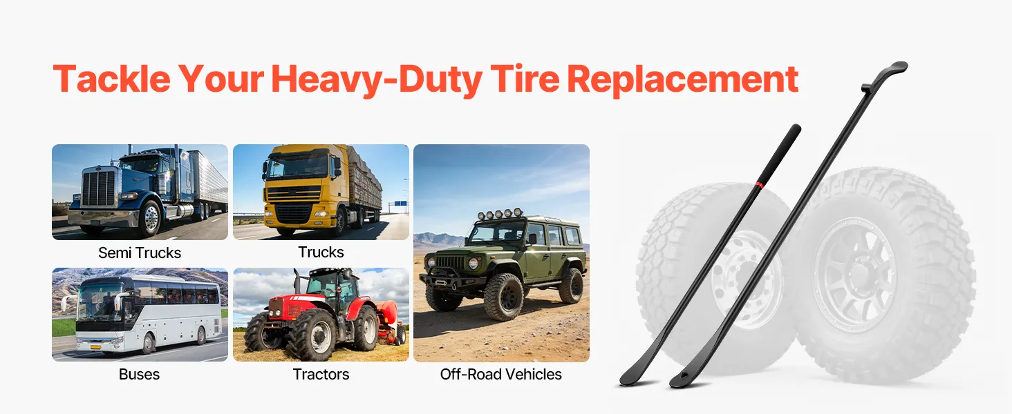 Unser Reifenmontagewerkzeug ist mit den meisten gängigen schlauchlosen Reifen von Sattelzügen, SUVs, Wohnmobilen, Lkw, Geländewagen und Landmaschinen kompatibel. Es eignet sich ideal für Lkw-Besitzer, professionelle Mechaniker und die Wartung von Nutzfahrzeugen.