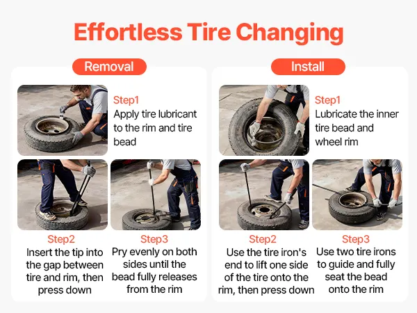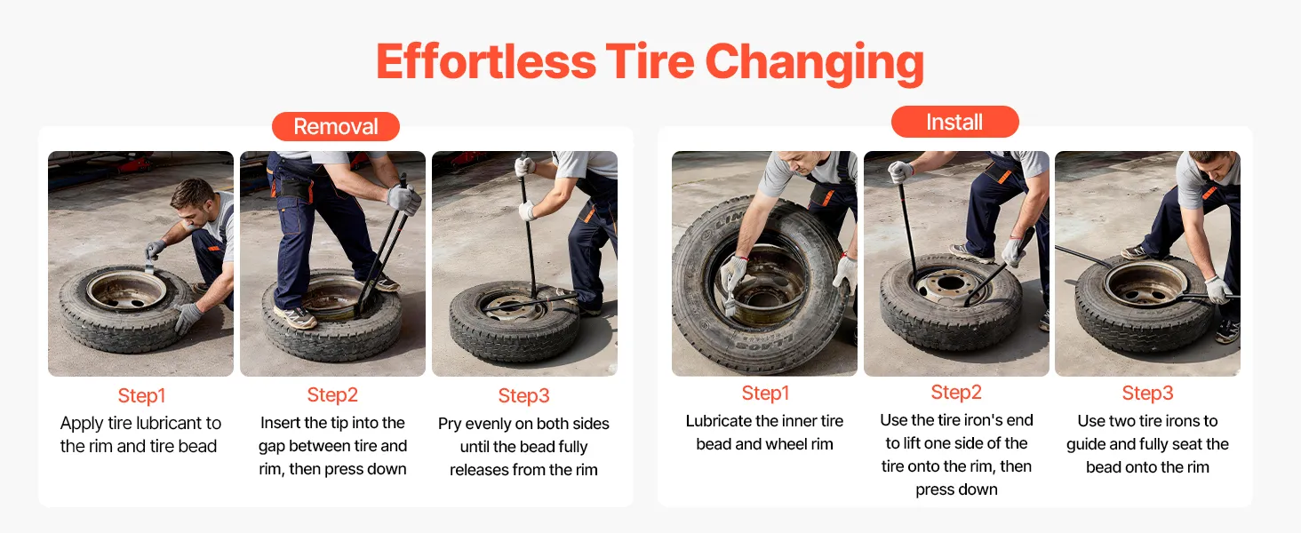 Ergonomisch und tragbar: Der glatte Schaft des Reifenmontierwerkzeugs sorgt für einen komfortablen Griff und einfache Bedienung. Dank seiner kompakten Größe lässt es sich bequem im Kofferraum oder in der Garage verstauen. Es werden weder Strom noch zusätzliche Werkzeuge benötigt – ideal für Fahrer und Mechaniker