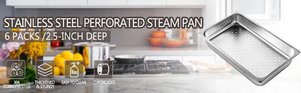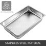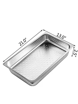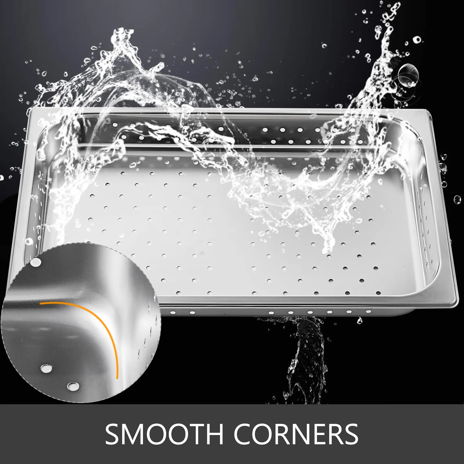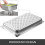 Der gelochte Behälter aus Edelstahl 304 in Lebensmittelqualität mit Abmessungen von 21"x13"x2,5" ist korrosionsbeständig, langlebig und leicht zu reinigen. Das gelochte Design erleichtert das schnelle Abtropfen von gewaschenem Gemüse und Obst. Perfekt zum Abtropfen und Dämpfen.