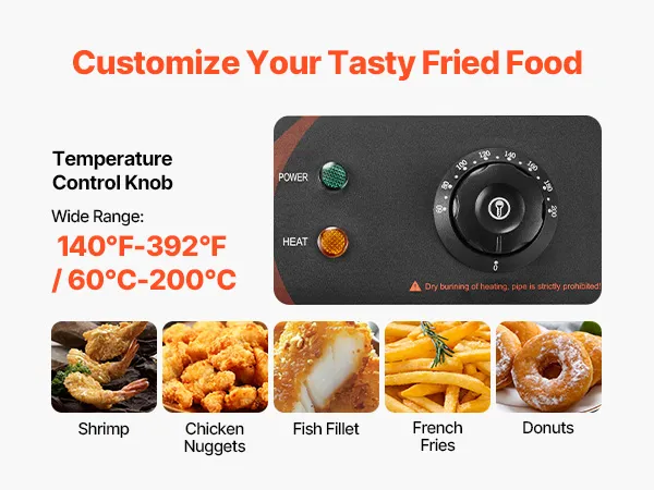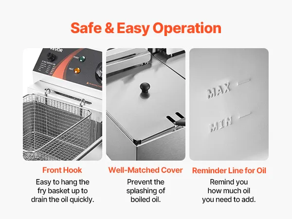 • 【SEPARAT EINZUSTELLEN】 - Diese Friteuse ist mit einer unabhängigen Kontrolle für jeden Tank ausgestattet. Temperaturbereich: 60 ~ 200 ℃. Die Kontrollleuchten „Power Light" und „Hot Light" zeigen den Betriebsstatus der Maschine an.