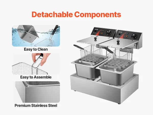 Diese 12 L 5000 W Doppel-Fritteuse ist die ideale Lösung, wenn Sie große Menge von Pommes Frites frittieren möchten. Zwei separat kontrollierte Behälter bieten 6 Liter Fassungsvermögen, so dass Sie gleichzeitig viele verschiedene Produkte frittieren oder nur jeweils eine nutzen können.