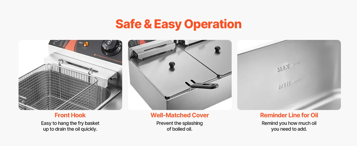 • 【12L FASSUNGSVERMÖGEN】 - Fassungsvermögen: 6 L + 6 L. Elektrische Fritteuse mit maximaler Leistung von 2500 W + 2500 W, um gleichzeitig große Menge von Pommes Frites und Snacks zuzubereiten.