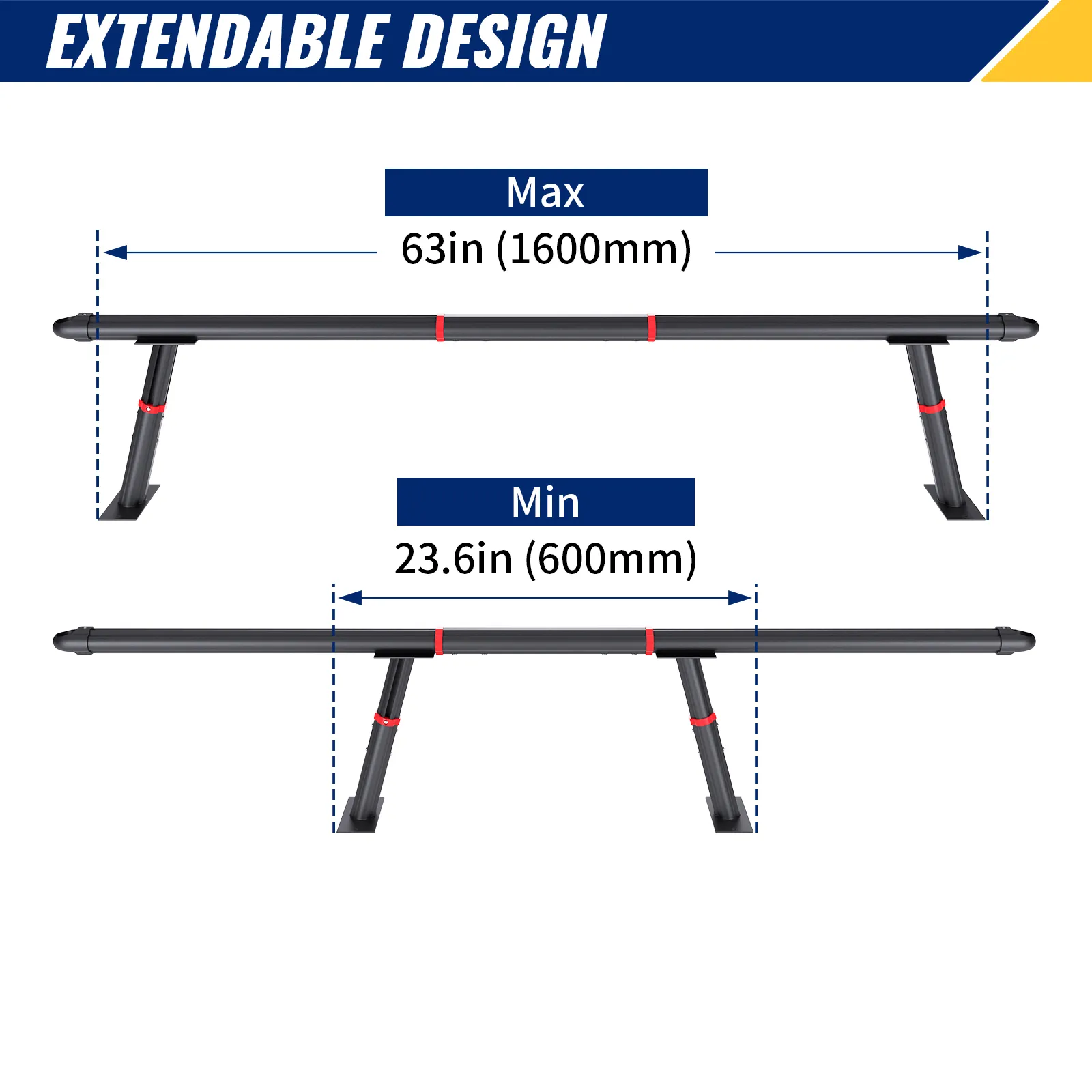 Einstellbare Länge: 23,6-63 Zoll / 600-1600 mm. Dieser Lkw-Ladeflächenständer ist gut geeignet, um übergroße Gegenstände zu transportieren, die nicht in die Ladefläche Ihres Lkw passen.