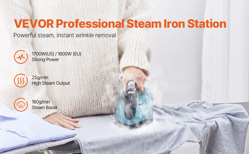 Leistungsstarke Bügelleistung: Mit 1600 W Leistung heizt sich dieses Dampfbügeleisen schnell auf. Unser Bügeleisen für Kleidung liefert 25 g/min Dauerdampf und 180 g/min Dampfstoß, um Falten im Handumdrehen effektiv zu glätten.