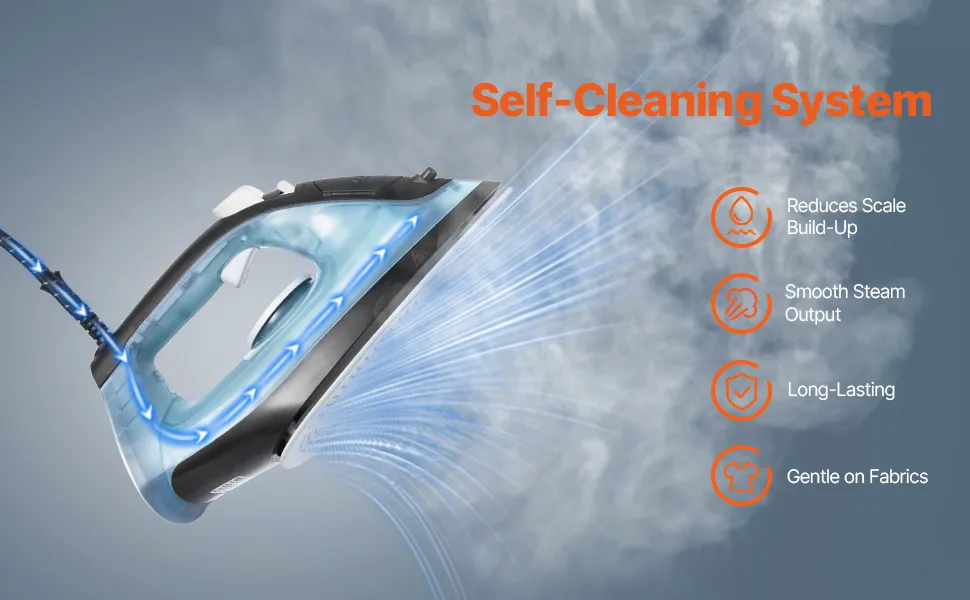 Fleckenfrei & langlebig: Dieses Bügeleisen ist mit einer Anti-Kalk- und Anti-Tropf-Technologie ausgestattet und bleibt während des Gebrauchs sauber und trocken. Es verhindert außerdem Flecken auf der Kleidung und verbessert die Haltbarkeit, wodurch die Lebensdauer Ihres Bügeleisens verlängert wird.