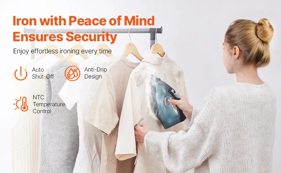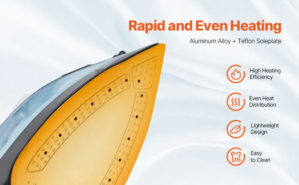 Dank der leistungsstarken Heizfunktion erreicht dieses Dampfbügeleisen für Kleidung schnell die optimale Temperatur für effektives Bügeln mit hoher Geschwindigkeit. Der große Dampfausstoß dringt problemlos in die Textilien ein und glättet hartnäckige Falten im Handumdrehen.