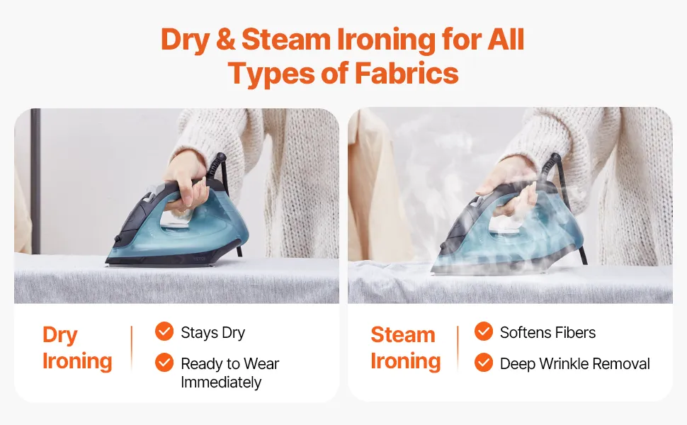 Wählen Sie zwischen Trocken- oder Dampfbügeln und passen Sie die Einstellungen flexibel an Stoffart und -dicke an. Trockenbügeln ermöglicht es Ihnen, Ihre Kleidung sofort nach dem Bügeln zu tragen, während Dampfbügeln Falten schnell und effektiv glättet.