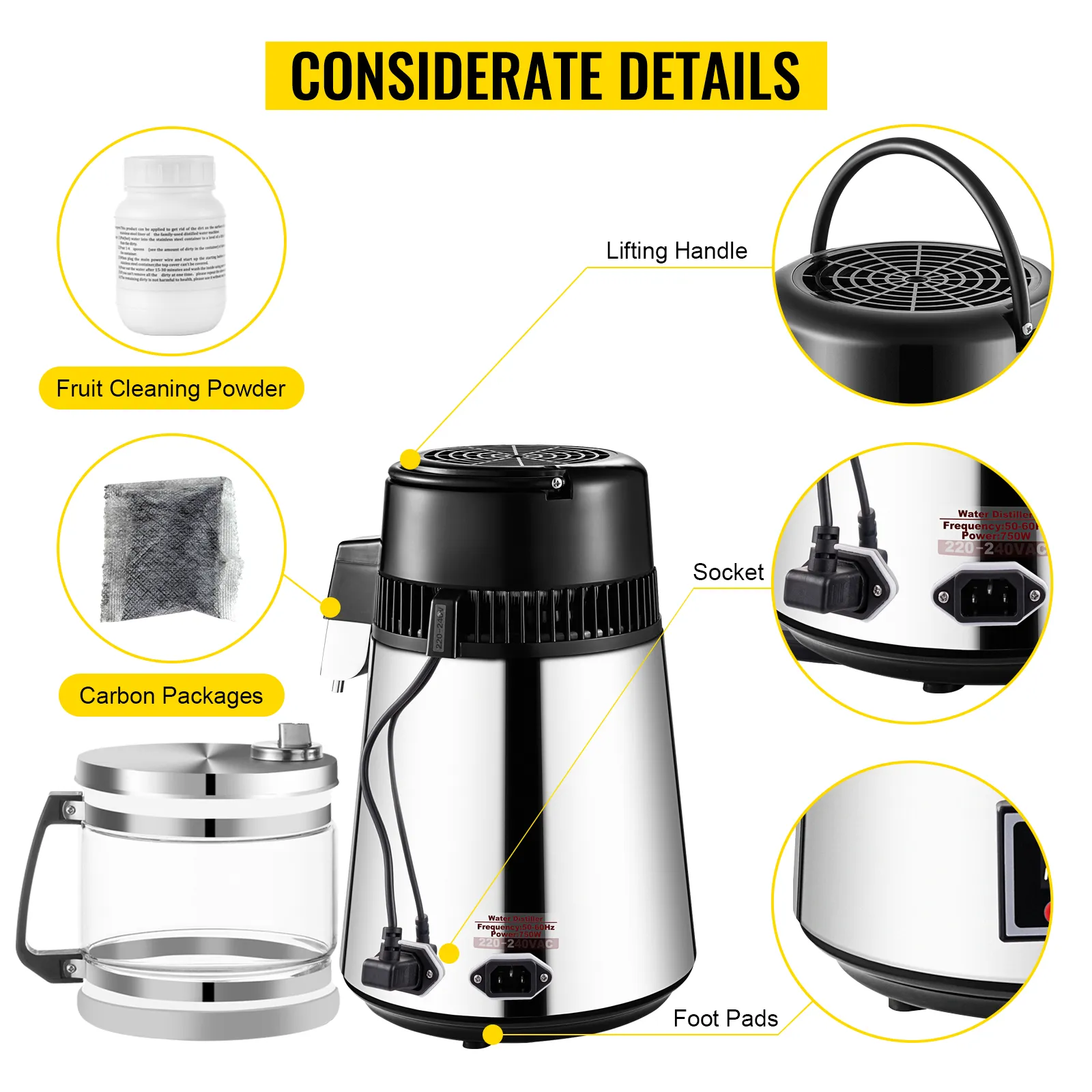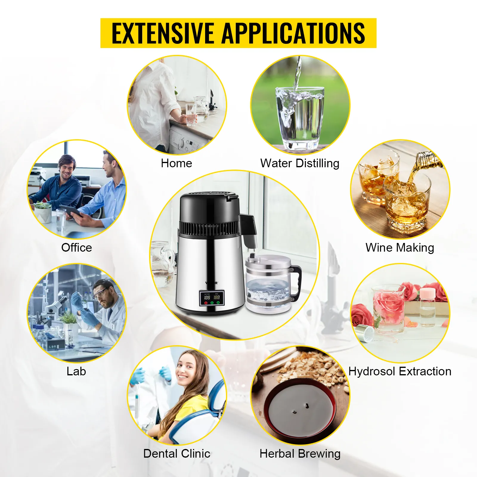 Das Wasserdestilliergerät von VEVOR ist ein perfektes Werkzeug zur Reinigung Ihrer Wasserversorgung, damit Sie zu Hause oder im Büro ständig mit destilliertem Wasser versorgt werden können. Dieser Destillierer kann VOC und Verunreinigungen aus Ihrem Wasser entfernen und die Destillationsgeschwindigkeit kann bis zu 1 L Wasser pro Stunde erreichen. Darüber hinaus ist es nicht viel größer als ein Wasserkocher und nimmt nicht viel Platz ein, was selbst für Ihre kleine Küche gut geeignet ist.