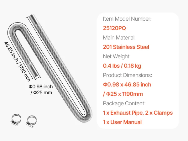 VEVOR Abgasrohr Standheizung flexibler Abgasschlauch 119 cm für Auto-Dieselheizung mit 2 Klemmen, Edelstahl Auspuffrohr mit Φ 25 mm Querschnitt für 2 kW / 5 kW / 8 kW Dieselheizungen Lufterhitzer