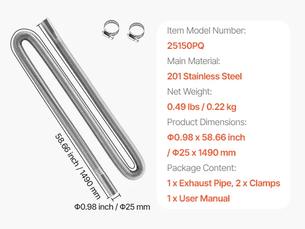 VEVOR Abgasrohr Standheizung flexibler Abgasschlauch 149 cm für Auto-Dieselheizung mit 2 Klemmen, Edelstahl Auspuffrohr mit Φ 25 mm Querschnitt für 2 kW / 5 kW / 8 kW Dieselheizungen Lufterhitzer