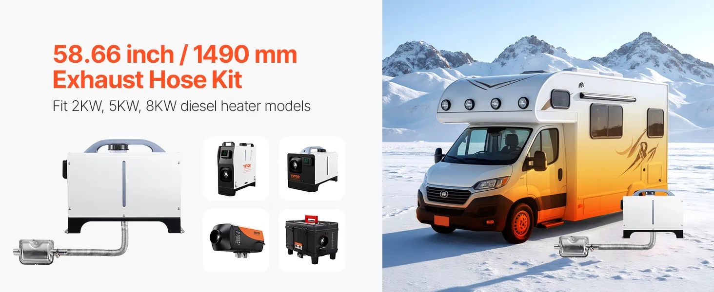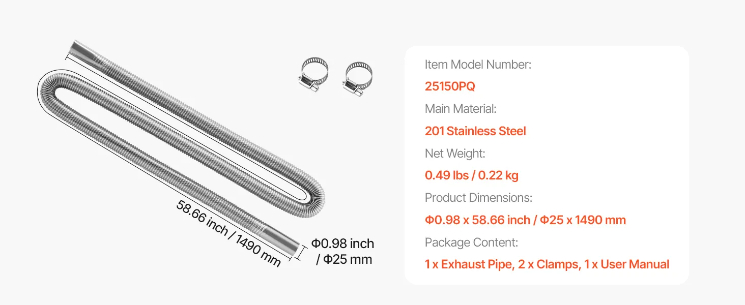 Abgasrohrpaket: Das flexible Auspuffrohr-Set für Dieselheizungen beinhaltet ein 58,66 Zoll (149 cm) langes Abgasrohr sowie zwei Klemmen und umfasst alle für die Installation und Wartung erforderlichen Komponenten. Das Produkt ist für die meisten Dieselheizungen konzipiert und gewährleistet einen reibungslosen Abgasstrom sowie eine zuverlässige Leistung