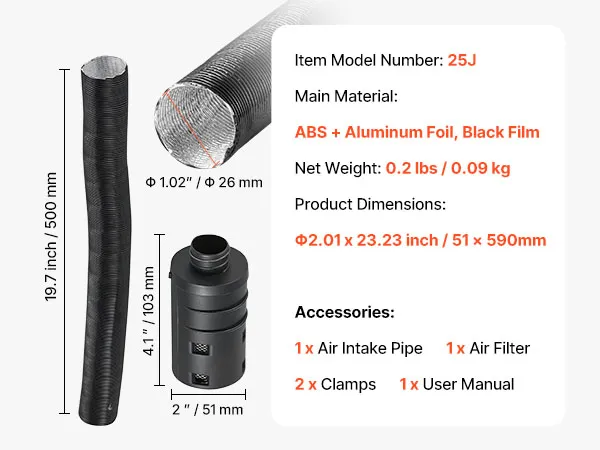 VEVOR Ansaugrohr Set für Dieselheizung, 25 mm Standheizungs-Kanalrohr, dehnbarer & biegbarer Luftansaugfilter-Schalldämpfer-Schlauchsatz für 2 kW 5 kW 8 kW Lufterhitzer