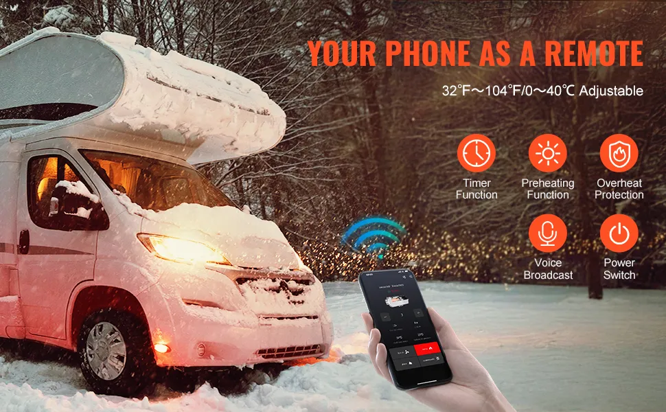 Die VEVOR Diesel-Autoheizung ermöglicht Ihnen eine einfache und komfortable Wärmeregelung. Sie haben drei Steuerungsmöglichkeiten: eine Bluetooth-App, eine Fernbedienung und ein übersichtliches LCD-Display am Gerät. Sie können die Heizung starten oder stoppen, die Temperatur ändern oder den Kraftstoffstand überprüfen, ohne aufstehen zu müssen. Mit der Bluetooth-App können Sie alles bequem von Ihrem Smartphone aus steuern – ideal, wenn Sie sich ausruhen oder im Zelt sind.