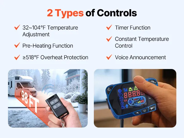 Die VEVOR-Standheizung mit Dieselmotor verfügt über eine 30 Meter lange Fernbedienung, mit der Sie die Heizung bequem ein- und ausschalten können. So können Sie Ihr Wohnmobil, Ihren LKW, Camper, Van oder Ihr Boot vorheizen, bevor Sie einsteigen. Der blaue LCD-Schalter ermöglicht die präzise Steuerung von Temperatur und Betriebsmodus und sorgt für eine einfache und komfortable Bedienung.