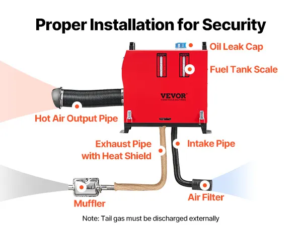 Diese Dieselheizung verfügt über ein wärmeisoliertes Abgasrohr, das Verbrennungen verhindert und angrenzende Oberflächen schützt. Der Tankdeckel ist auslaufsicher und minimiert so das Risiko von Kraftstoffverlusten während der Fahrt. Diese Eigenschaften gewährleisten einen sicheren Betrieb auch auf unebenen Straßen und bei Bodenwellen, ohne die Funktionsfähigkeit der Heizung zu beeinträchtigen.