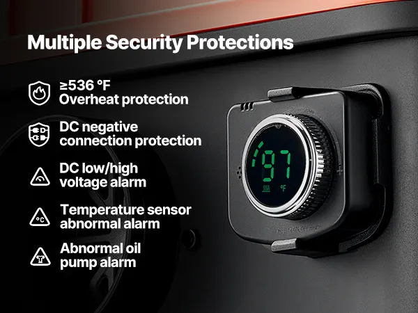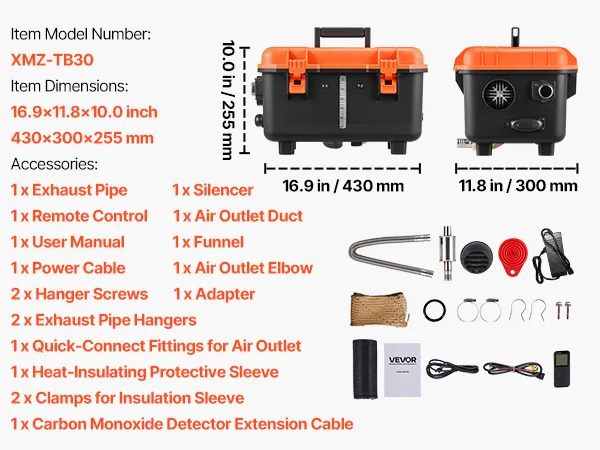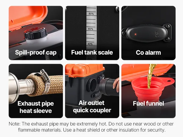 Sicherheitsfunktionen: Dieser Standheizung ist mit einem CO-Alarm, einer Abgasrohr-Wärmemanschette und einem versiegelten Tankdeckel für einen sicheren Langzeiteinsatz ausgestattet. Die interne Platine verfügt über eine Überhitzungsabschaltung (≥ 536 ℉ / 280 ℃), Verpolungs- und Überspannungsschutz